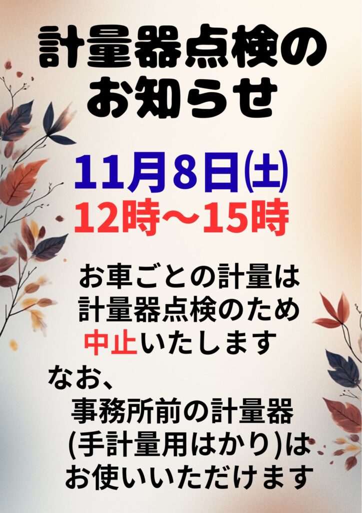 計量器点検を11月8日㈯の12時~15時の間に実施するため、一時的にお車ごとの計量を中止いたします。