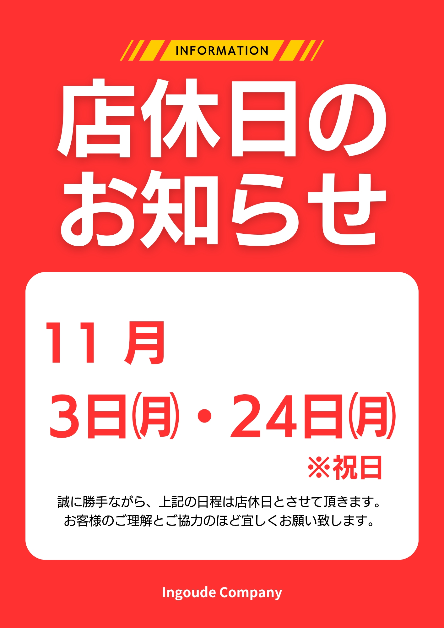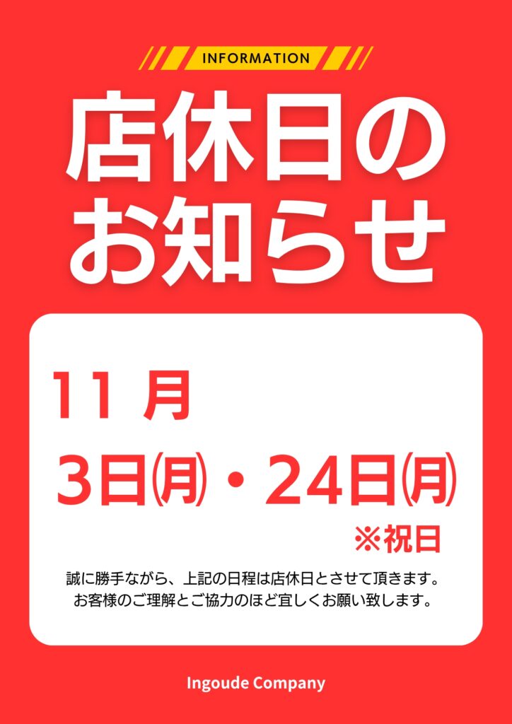 11月は日曜日・3日㈪文化の日・24日㈪勤労感謝の日の振替休日にお休みをいただきます。