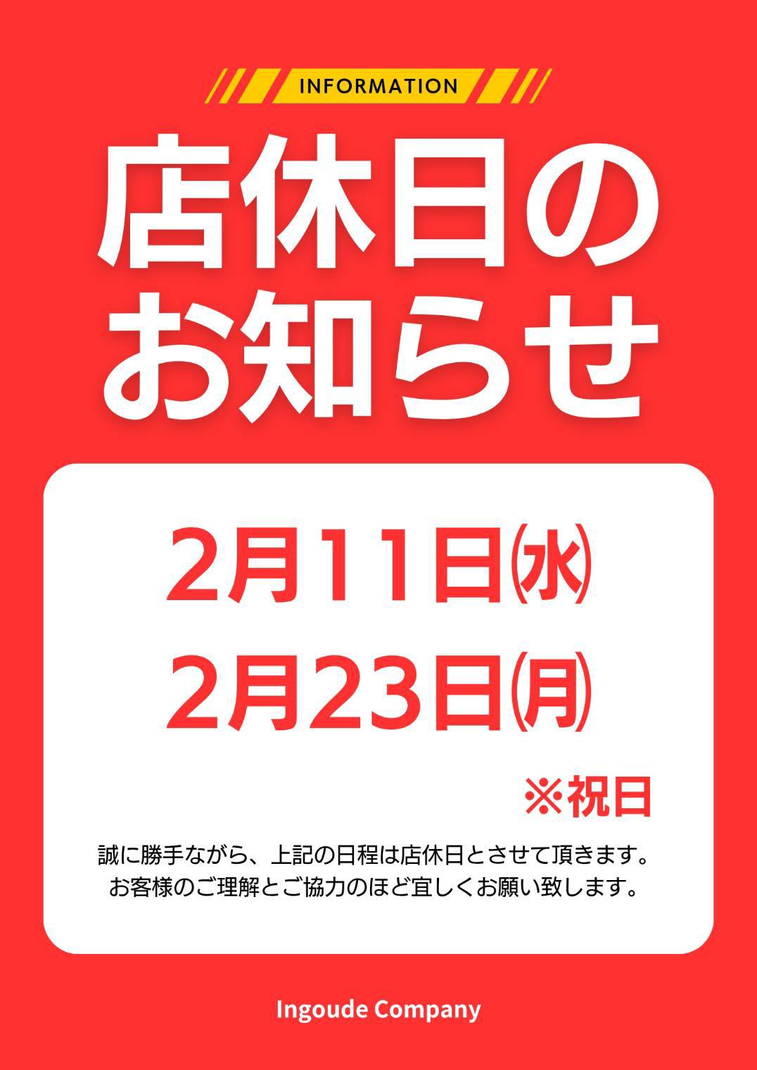 2月は日曜日と11日㈬・23日㈪にお休みをいただきます。